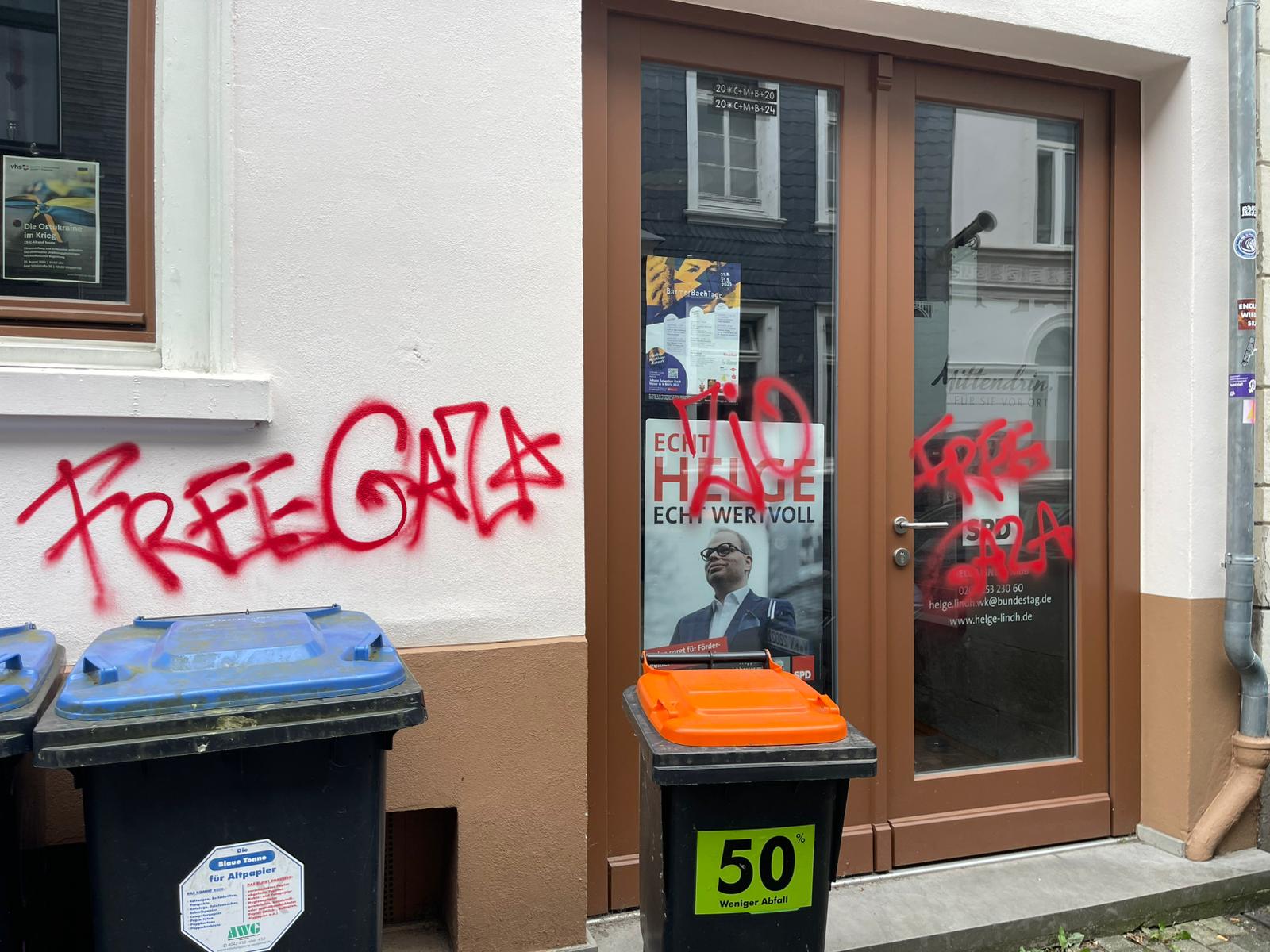 Das Büro des Bundestagsabgeordneten Helge Lindh in Wuppertal ist einmal wieder attackiert worden – mit der Parole „Free Gaza“ in roter Farbe, ergänzt um das Kürzel „Zio“ auf dem Plakat mit seinem Konterfei.