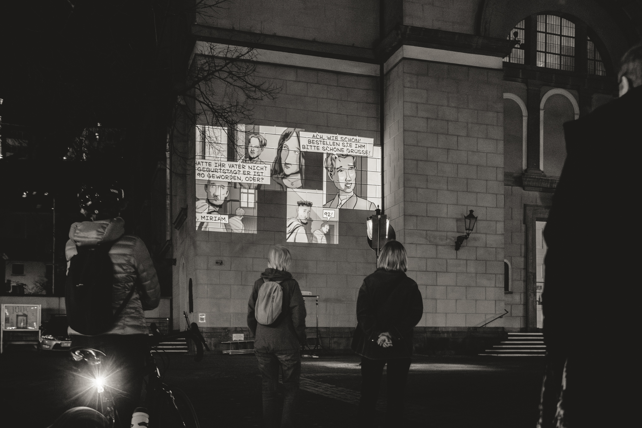 Gezeigt wurde in einer Großprojektion die Comicstory um zwei benachbarte Familien, einer jüdischen und einer muslimischen, albanisch-stämmigen. Zahlreiche Passanten schauten sich die etwa 15-minütige Animation an, auch kamen die Künstler mit albanischen Mitbürgerinnen ins Gespräch über den Ehrenkodex BESA. Das Projekt soll nun - je nach Fördersituation - durch NRW touren. Die Website wurde nach der Premiere freigeschaltet, hier findet man weitere Informationen und auch den animierten Kurzfilm: https://kck42.de/besa/